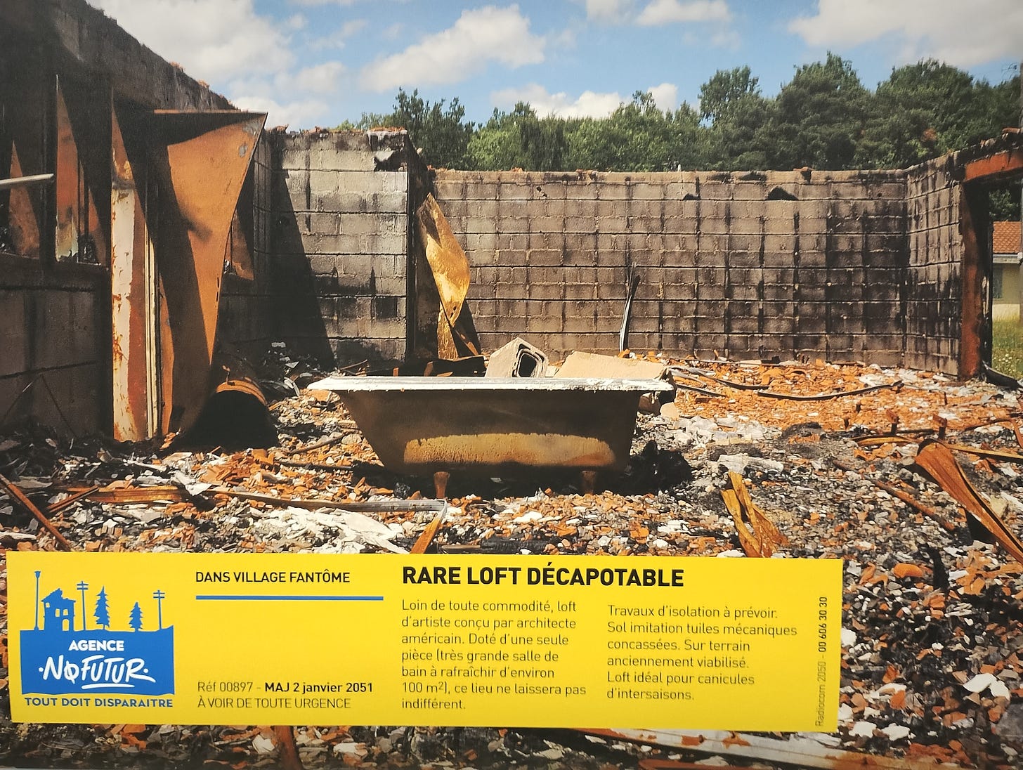 Me laissant guider par la spontanéité, je me retrouve à notre majestueuse Bibliothèque Abbé-Grégoire, où ma volonté initiale fut de retrouver ma routine bien ancrée, de rejoindre les étages afin de flâner sur les allées de cette inégalable antre culturelle. Avant même de fouler un quelconque escalier, Jonathan, un ami qui gère la sécurité sur place, m’attire dans une discussion banale et chaleureuse dont nous avons l’habitude. Mais, sans le savoir, au détour de cette conversation, il lâcha un lapin identique à celui d’Alice que je ne cesserais de suivre en cette après-midi. Une petite exposition, nommée Tout doit disparaître, était installée juste dans le prolongement du hall. Et là, dès le premier coup d’oeil sur les affiches, première claque : Je suis saisis par le concept unique que propose son auteur. Dominique Hermier, un artiste-designer qui a installé son atelier en centre-ville (rue Saint-Honoré), créateur de IKEX la galerie d’objets décalés comme satire à la fameuse enseigne suédoise, avait donné vie à une troublante agence immobilière fictive, l’Agence No Futur.
